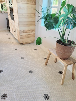 Een keuken-, eetkamer- en halvloer voorzien van marmer mozaïek tegeltjes. Omdat dit uit kleine stukjes bestaat, kun je er zelf een creatieve draai aan geven. Hier is er gekozen voor een bloemmotief.