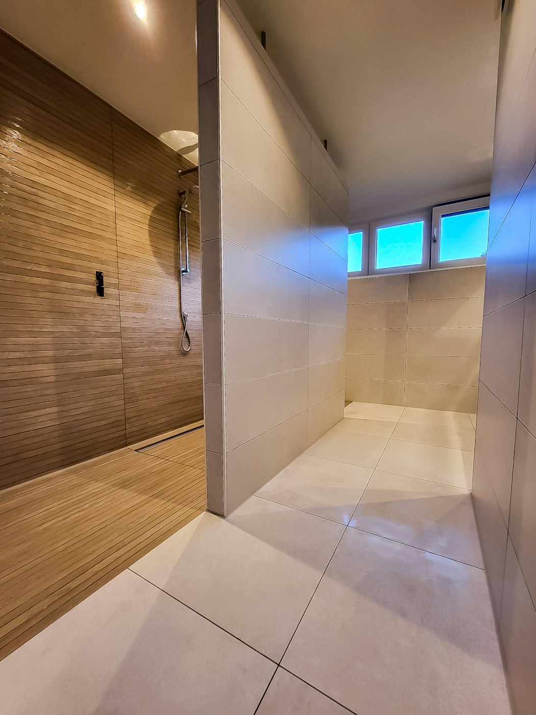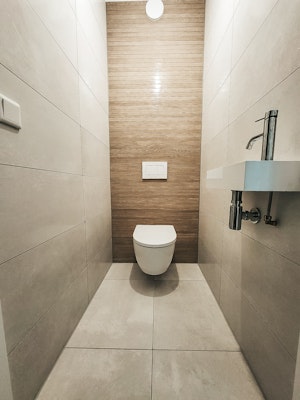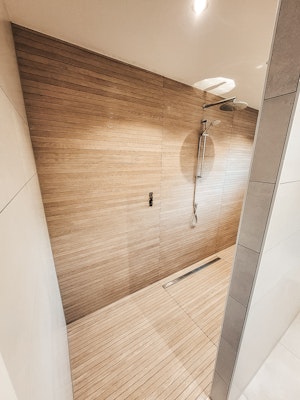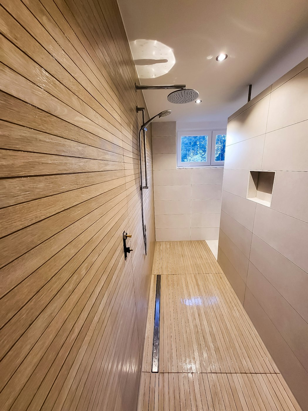 Voor de renovatie van deze badkamer en het toilet besloot de klant de "scheepsbouw" stijl te gebruiken in de doucheruimte en de achterwand van het toilet. Zo creëer je een warm houtgevoel!